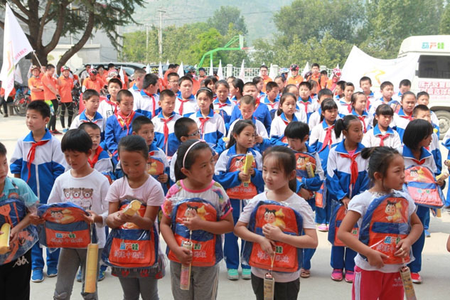 當走進高而鄉出泉溝小學,騎行隊員們根據孩子們的需求帶來了眾多開學的禮品,有尊龍凱時特制書包、特制作業本、筆等學習用品,另有杭州天堂傘為同學們撐起一片蔚藍的天空,讓尊龍凱時感受到了所有騎行隊員的用心。