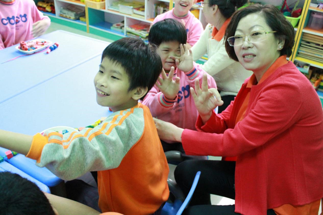▲基金會執行理事長劉景萍女士帶領孩子們做手工