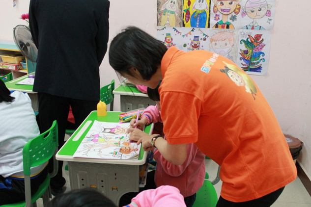 ▲志愿者引導孩子給圖畫上色