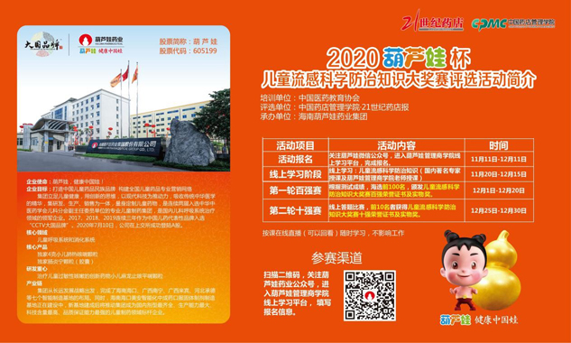 本次大賽旨在將兒童流行性感冒的科學防治知識廣泛傳播給藥店店員和城鄉居民,以提升兒童感冒的科學防治水平,降低兒童感冒的患病率。大賽面向全國藥店店員廣泛開展,采取線上報名、線上學習、線上答題的方式進行。大賽期間,將聘請國內著名兒科專家對兒童流感科學防治知識進行授課,學員可以邊報名、邊學習、邊答題,報名時間從11月11日開始,截止12月11日。第一輪答題截止日期為12月20日,12月23日公布百強學員名單并予以表彰。第二輪比賽時間為12月25日-30日,由百強學員進行晉級答題,最后產生全國十強,并將在藥店管理學院峰會上進行現場頒獎。