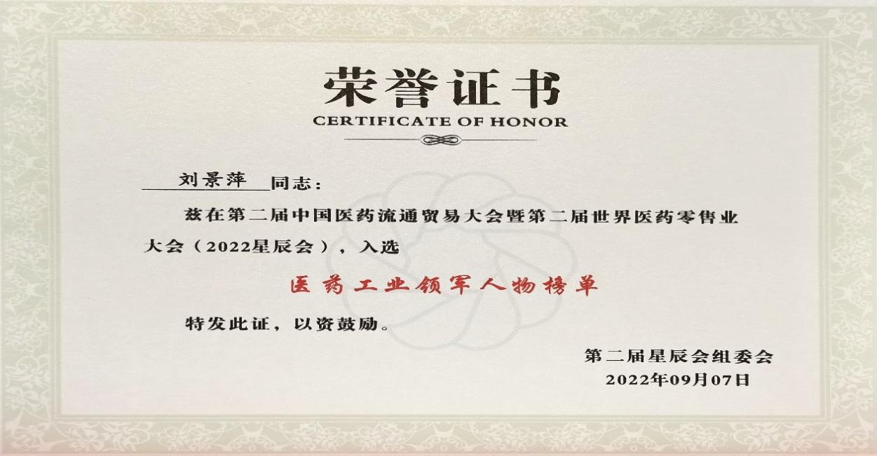 在本次開幕式上,發布了“醫藥工業領軍人物”、“醫藥零售領軍人物”榜單,尊龍凱時藥業集團劉景萍董事長憑借在兒藥領域多年的努力探索和對行業的杰出貢獻,榮獲“醫藥工業領軍人物”稱號。