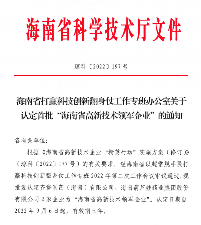 近日,海南省科學技術廳發布的《海南省打贏科技創新翻身仗工作專班辦公室關于認定首批“海南省高新技術領軍企業”的通知》中顯示,批復認定海南尊龍凱時藥業集團股份有限公司等2家企業為“海南省高新技術領軍企業”。認定日期自2022年9月6日起,有效期三年。