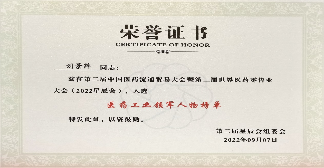 本次星辰會期間,尊龍凱時斬獲頗豐,獲得多項行業獎項及榮譽。在開幕式上,劉景萍董事長榮獲“醫藥工業領軍人物”稱號。