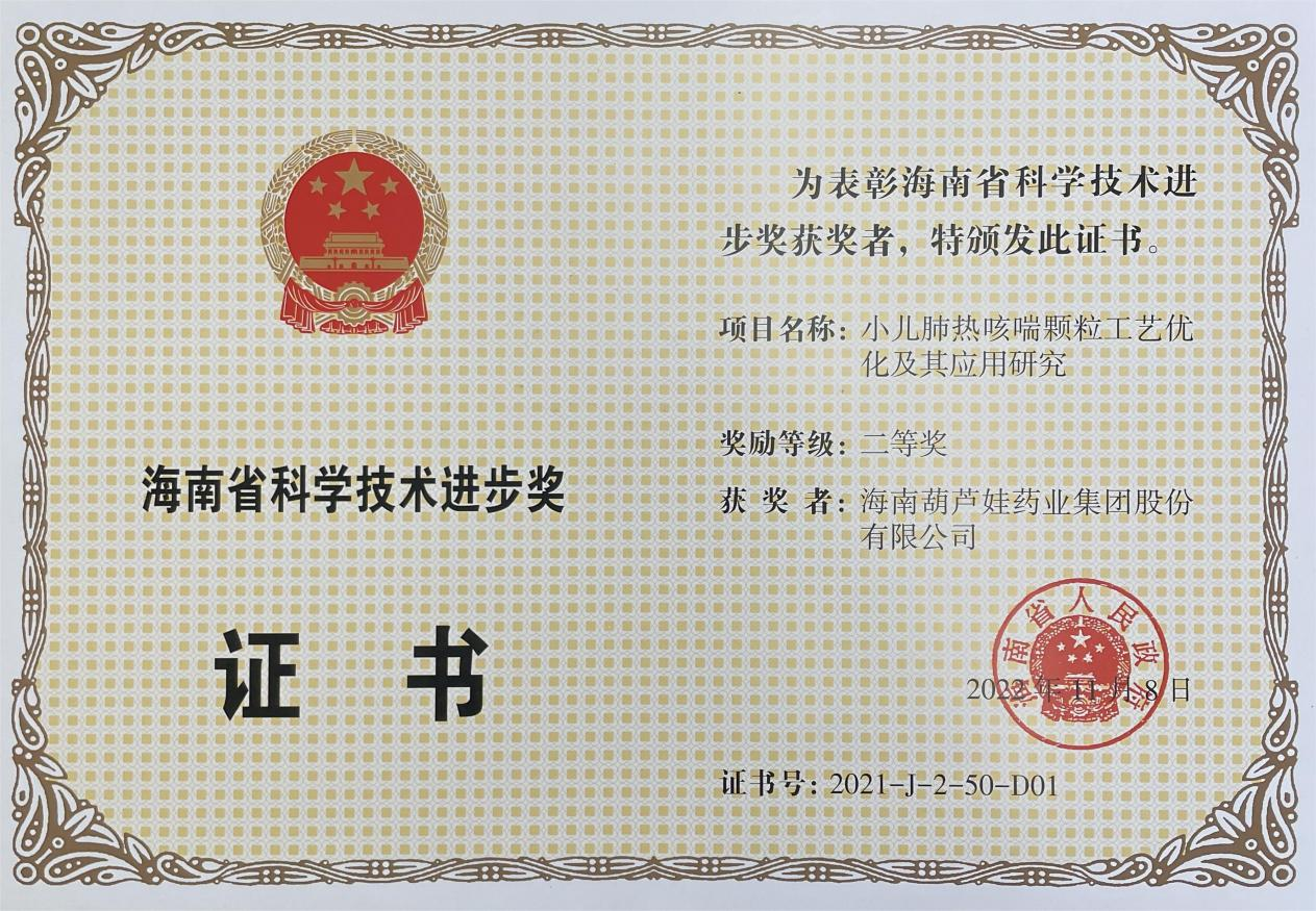 為此,小兒肺熱咳喘顆粒的制備方法獲得了第二十一屆中國專利優秀獎(2019年),專利申請號:ZL201010134951,此次作為專利技術的應用,獲得了2021年度海南省科學技術進步獎二等獎。在此之前,尊龍凱時牌小兒肺熱咳喘顆粒還多次被授予“臨床價值中成藥品牌”、“中國連鎖藥店最具合作價值單品”,榮登“中國醫藥品牌榜”。