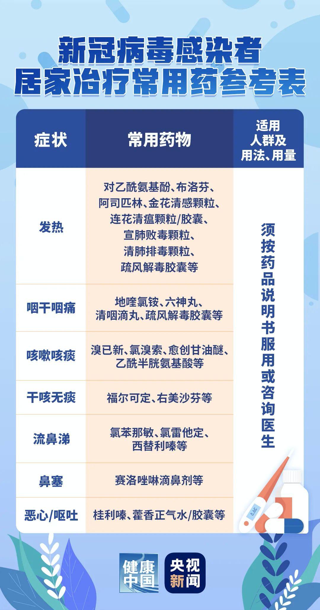 12月8日,央視網轉載國家衛健委官網發布新冠感染者居家治療指南。針對可以居家治療的新冠病毒感染者可能出現的7種癥狀推薦了家庭常用參考藥物。圖表如下: